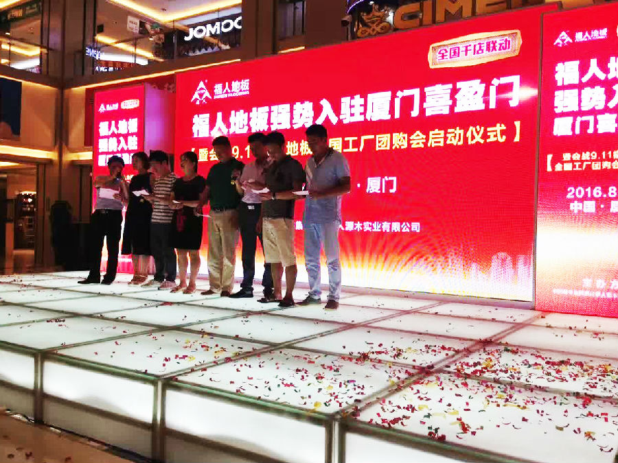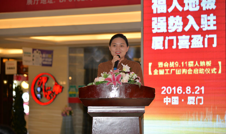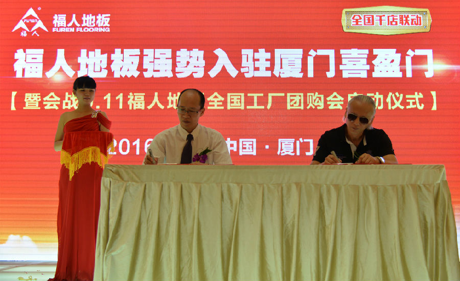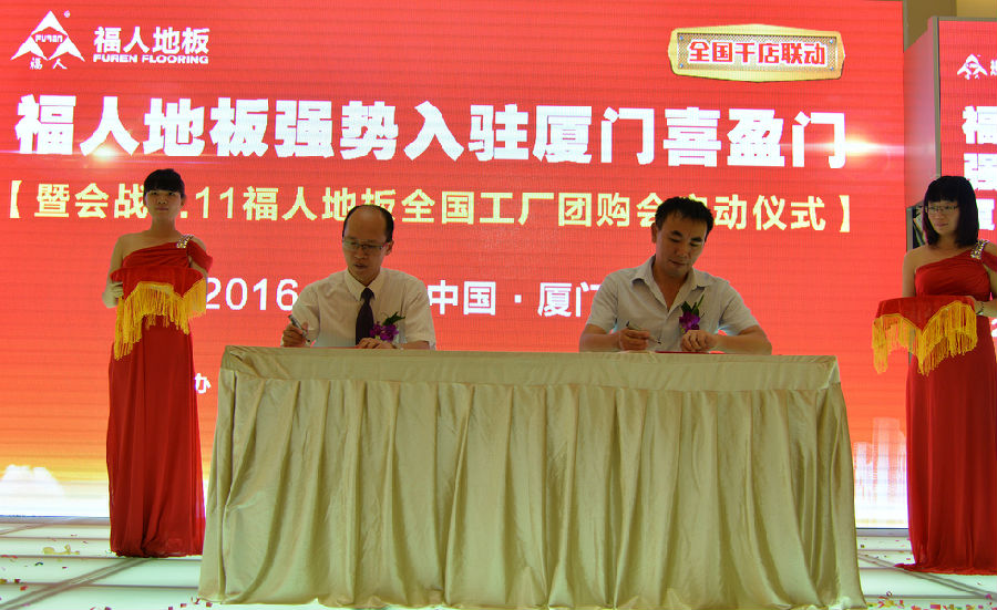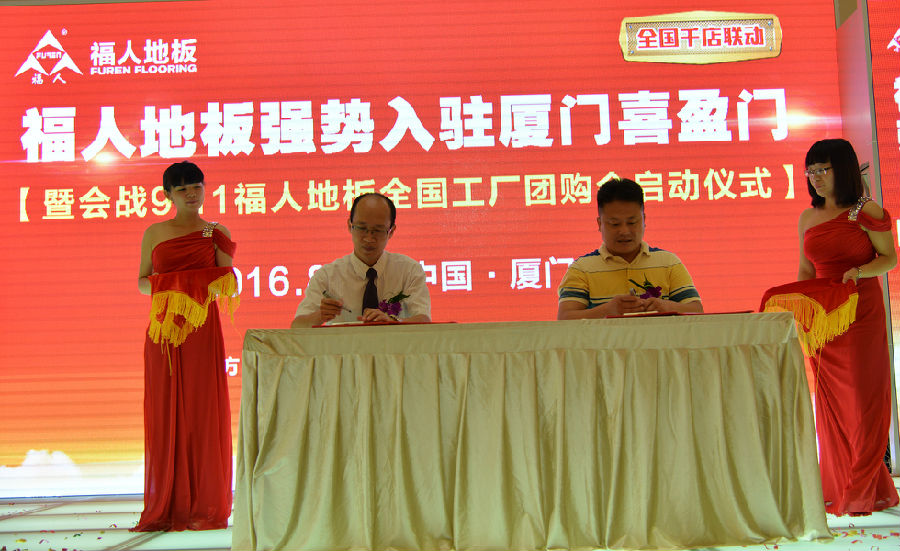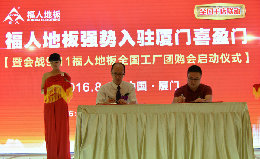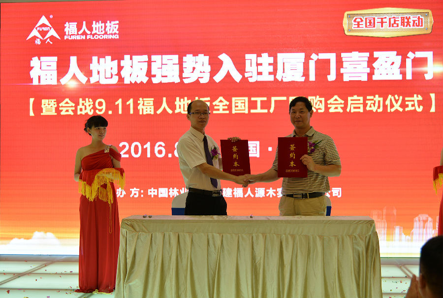 2016年8月21日,作為地板行業(yè)領(lǐng)軍品牌的福人地板在鷺島----廈門(mén)隆重舉行了"福人地板強(qiáng)勢(shì)入駐廈門(mén)喜盈門(mén)暨會(huì)戰(zhàn)9.11福人地板全國(guó)工廠團(tuán)購(gòu)會(huì)啟動(dòng)儀式"。此次活動(dòng)慶典特別邀請(qǐng)廈門(mén)喜盈門(mén)領(lǐng)導(dǎo)肖麗麗、福建省產(chǎn)品質(zhì)量檢驗(yàn)研究所領(lǐng)導(dǎo)顏副所長(zhǎng)、廈門(mén)長(zhǎng)泰建材商會(huì)湖珠秘書(shū)長(zhǎng)鄭賀明、中林福人銷售總監(jiān)石開(kāi)洪、廈門(mén)裝飾界代表、福人地板優(yōu)秀經(jīng)銷商代表及各大新聞媒體參加。