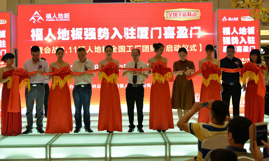 石總及嘉賓領(lǐng)導(dǎo)為福人地板廈門(mén)喜盈門(mén)專賣(mài)店剪彩