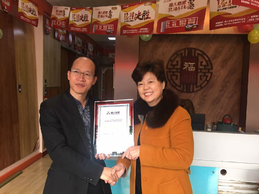 石總為永定福人頒發(fā)“福建十佳專賣店”獎(jiǎng)牌