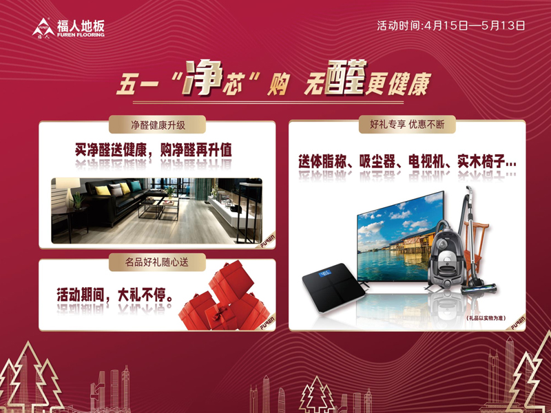 據(jù)悉此次福人地板【五一“凈芯”購】活動將一直持續(xù)到5月13日,全國各大門店都有眾多優(yōu)惠等著大家,歡迎大家五一期間到附近門店選購。
