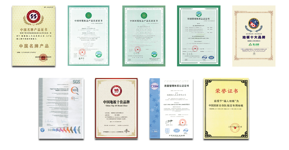 福人產(chǎn)品先后通過質(zhì)量體系、環(huán)境管理體系、計量檢測體系認(rèn)證和國際管理體系認(rèn)證,并通過了中國方圓標(biāo)志和中國環(huán)境標(biāo)志產(chǎn)品雙認(rèn)證,福人強(qiáng)化地板被中國抗菌材料及制品行業(yè)協(xié)會評為“中國抗菌標(biāo)志產(chǎn)品”;2008年榮獲國家知識產(chǎn)權(quán)授予的發(fā)明專利證書及美國加利福尼亞亞洲空氣資源委員會授予的CARB認(rèn)證;福人地板成為地板行業(yè)第一家“建材下鄉(xiāng)專用地板”和國家擊劍隊指定專用地板。